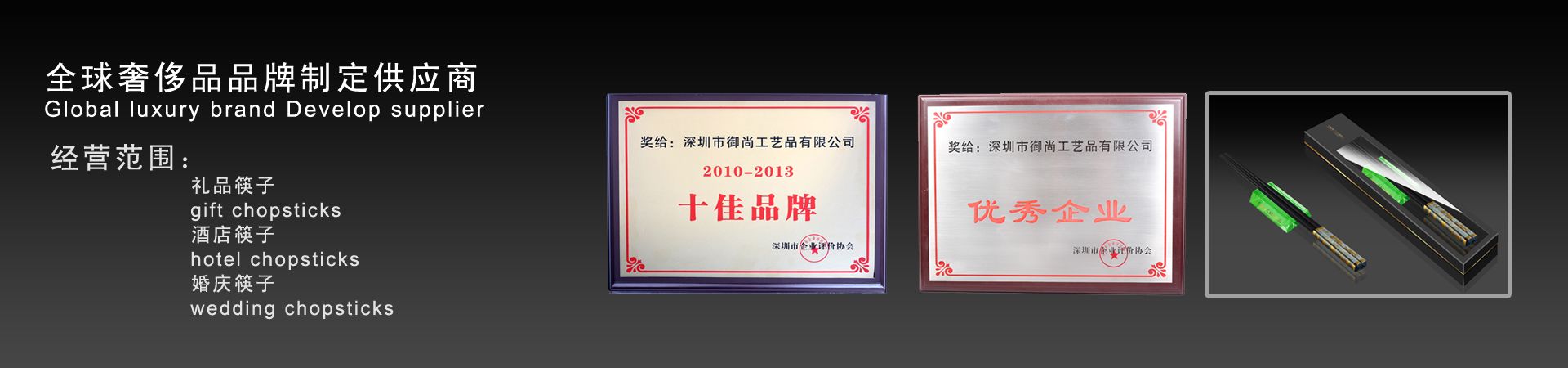 御尚健康產(chǎn)業(yè)(深圳)有限公司旗下御尚工藝筷子榮獲深圳市企業(yè)評價協(xié)會授予的2013年度“優(yōu)秀企業(yè)”和年度“十佳品牌獎”稱號。 深圳市御尚工藝品前身為深圳市御尚工藝筷子廠,是御尚健康產(chǎn)業(yè)(深圳)有限公司和香港御尚實(shí)業(yè)有限公司全資子公司,是一家專業(yè)從事高檔筷子及紅木工藝品設(shè)計,研發(fā)和銷售及生產(chǎn)為一體的專業(yè)供應(yīng)商,位...【更多詳情】 |